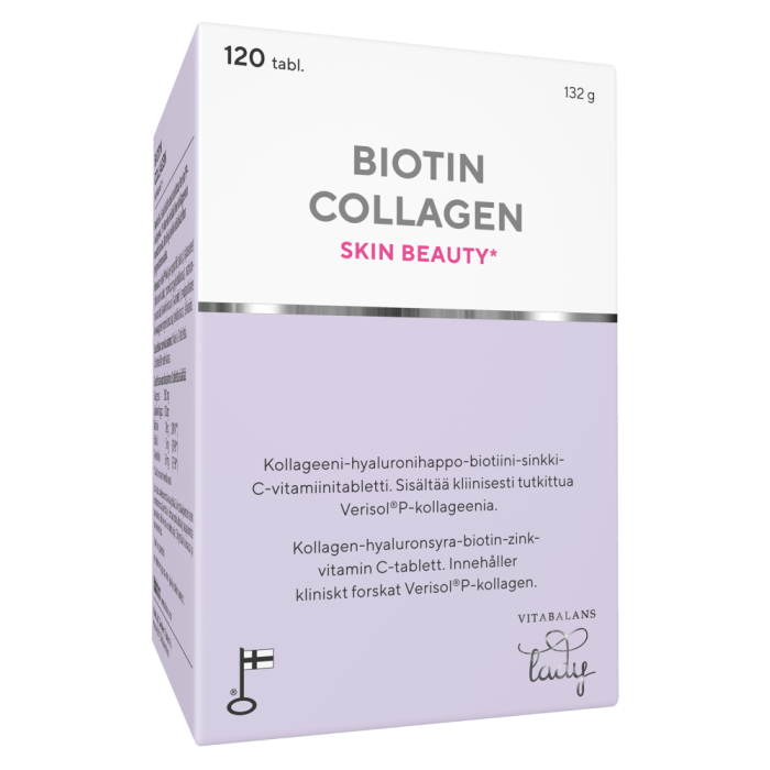 Biotin Collagen Skin Beauty innehåller kliniskt studerat Verisol® P-kollagen. Verisol® P-kollagen är typ I-kollagen som har brutits ner till mindre kollagenpeptider för att förbättra absorptionen. Förutom kollagen innehåller produkten hyaluronsyra, zink, biotin och C-vitamin. C-vitamin främjar hudens egen kollagenproduktion. Biotin och zink bidrar till att huden förblir normal.