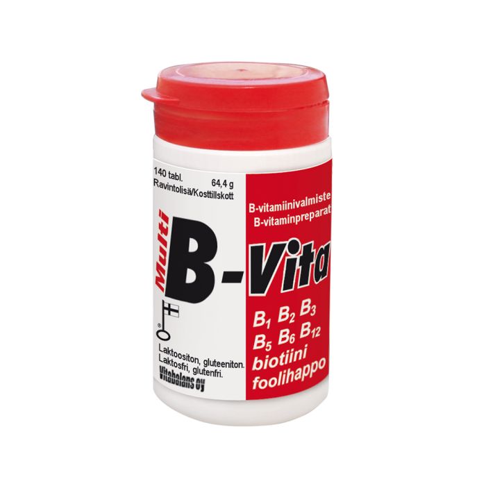 Multi B-Vita on monipuolinen B-vitamiinivalmiste, jossa on kaikki tärkeät B-vitamiinit yhdessä tabletissa. B-ryhmän vitamiinit ovat välttämättömiä terveydelle, psyykkiselle hyvinvoinnille ja jaksamiselle.